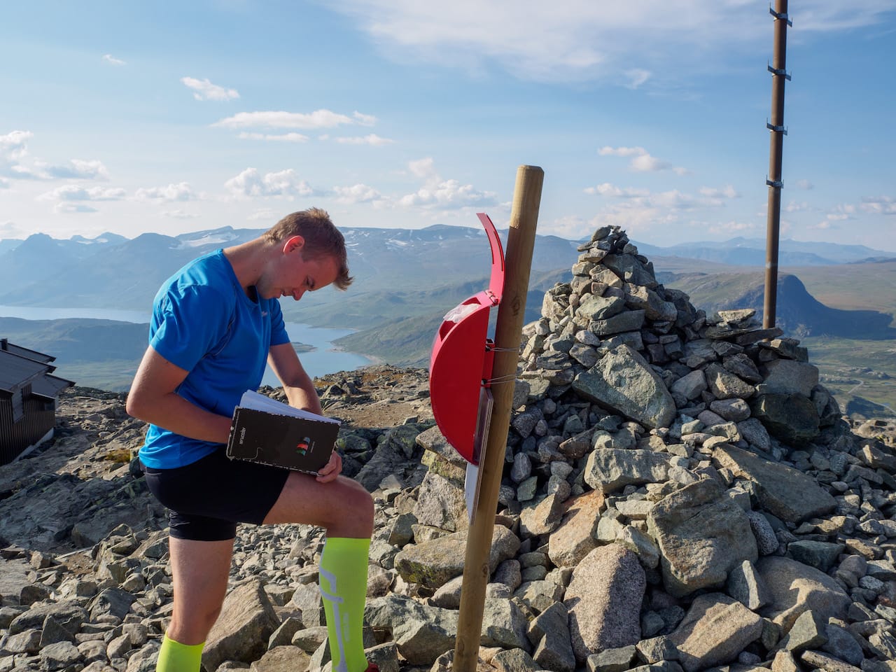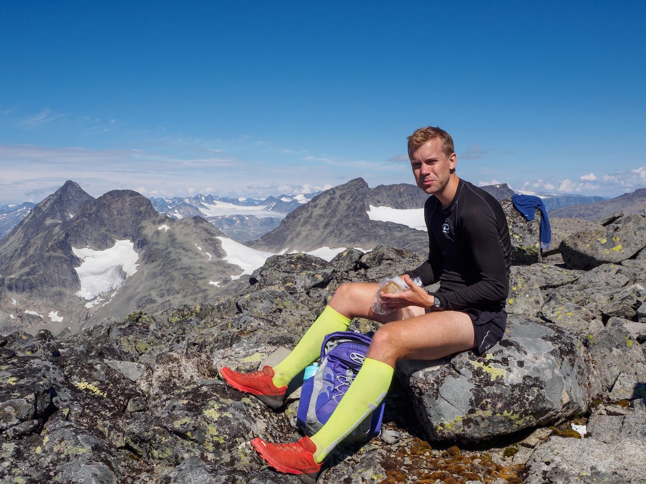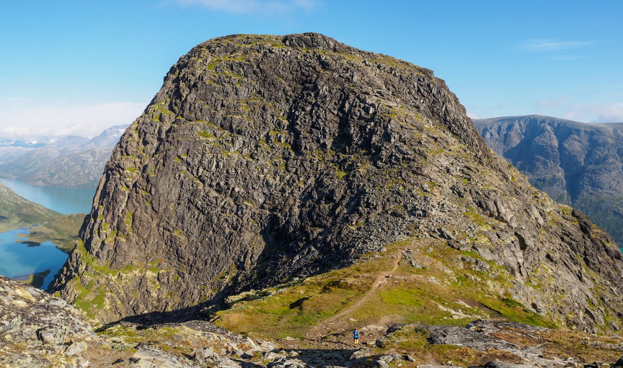 Før turen hadde vi sjekka Strava-rekorden opp til toppen, på ca 35 minutter. Vi pusha litt, og Eirik løp i forveien et stykke for å se hva som var mulig, men vi kom til at det nok var en topp for mye for oss denne dagen. Kanskje greit at det ikke bare er å troppe opp med 9 timers tur i beina og plukke segmenter? Så derfra tok vi det mer kontrollert til toppen, hvor vi ble belønna med herlig utsikt mot Gjende, Besseggen og Besshøe, samt til nedre del av Leirungsdalen.