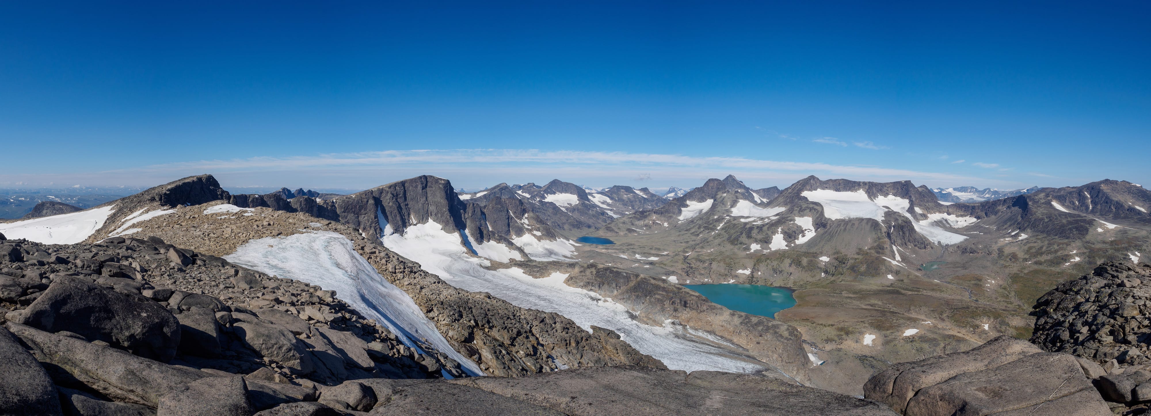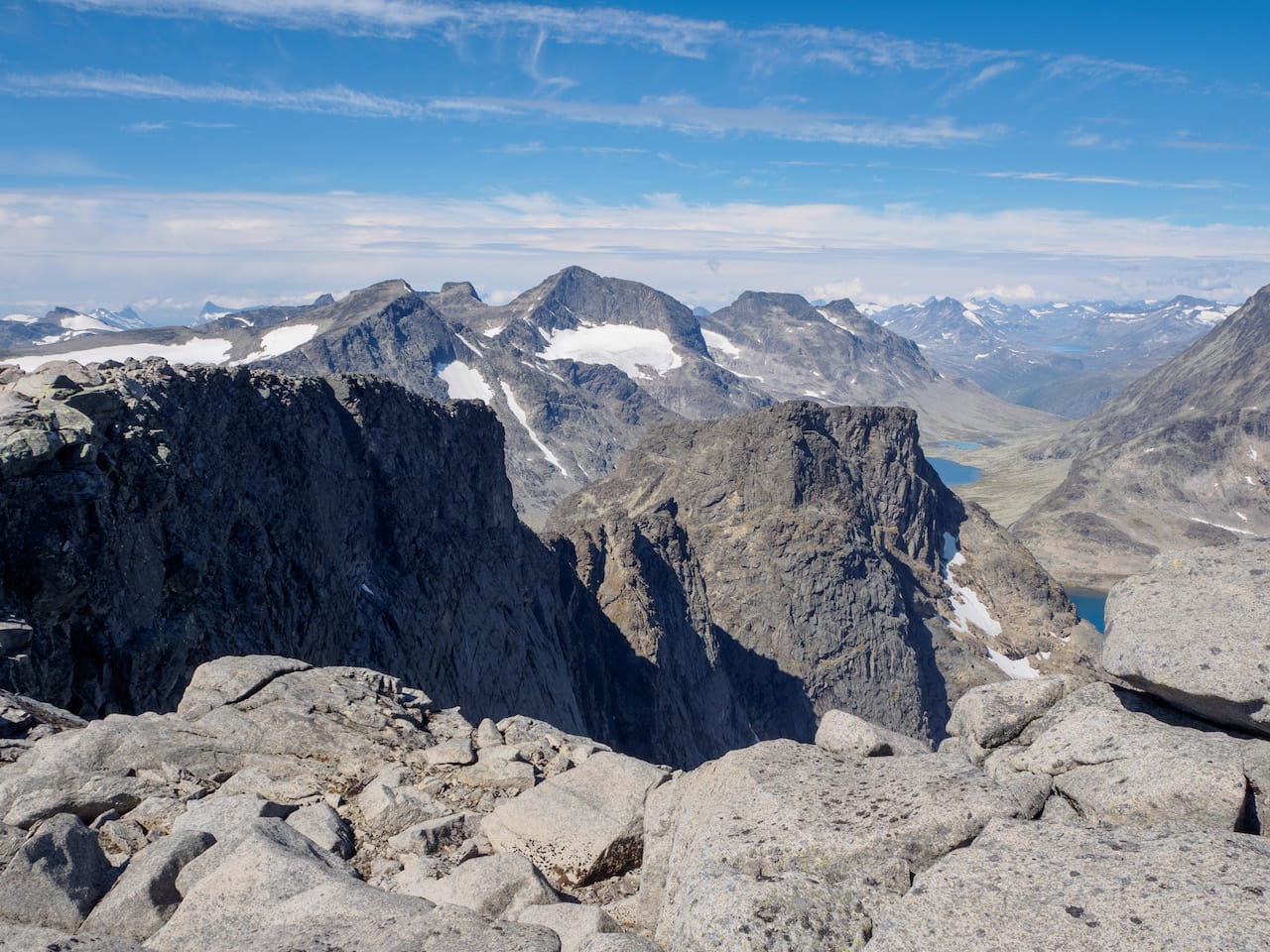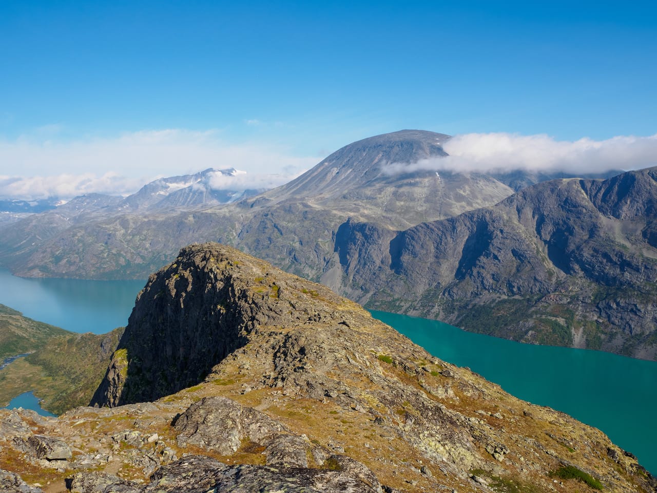 Utsikt fra hovedtoppen, med vesttoppen i forgrunnen, og så Gjende, Besseggen og Besshøe bakover.