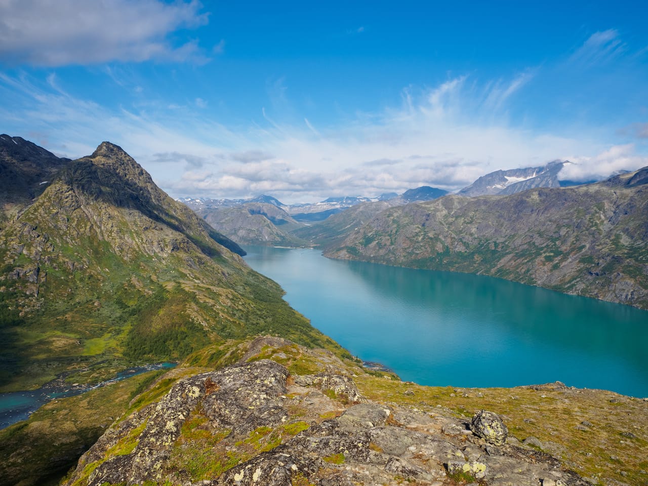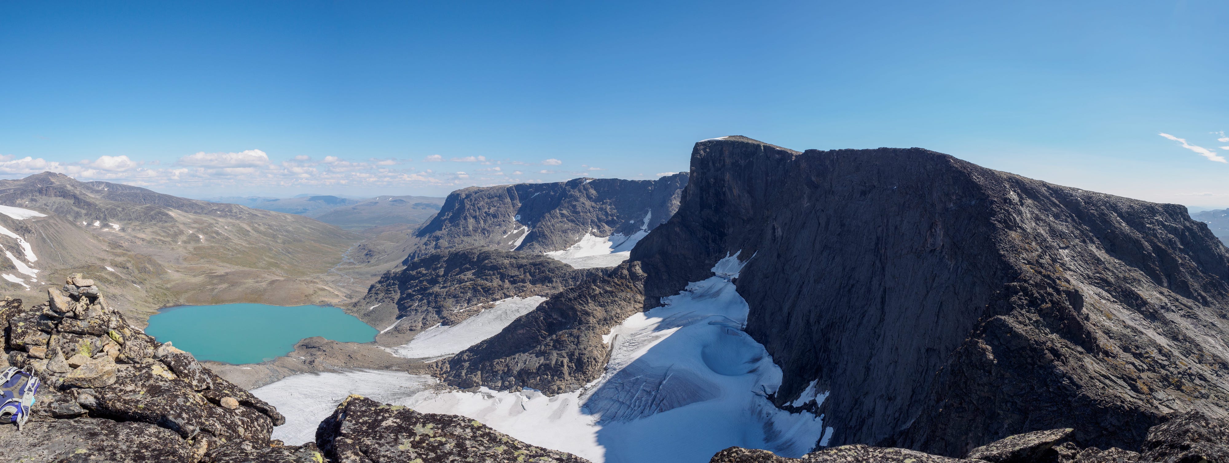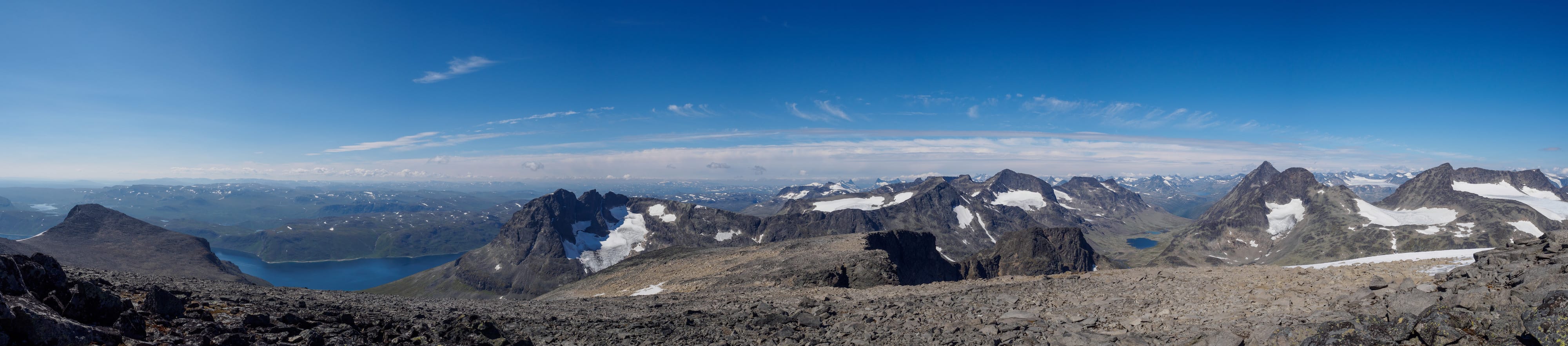 Utsikt fra hovedtoppen, med vesttoppen i forgrunnen, og så Gjende, Besseggen og Besshøe bakover.