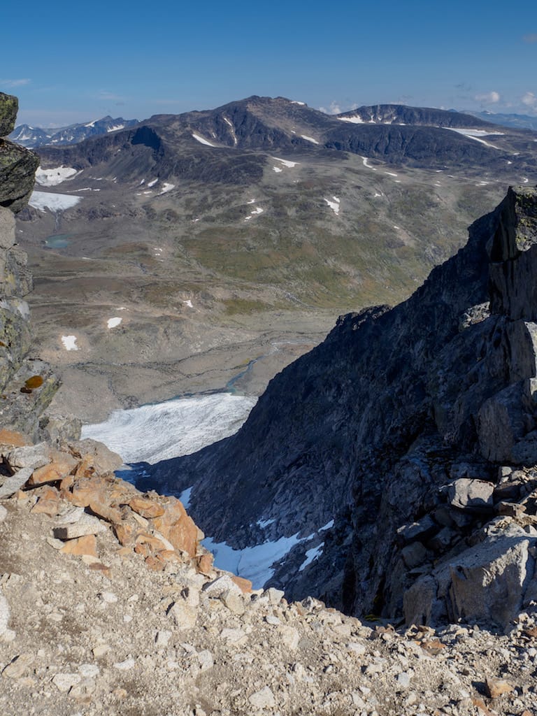 Fra Midtre Kalvehøgde satte vi sørover mot Nørdre Kalvehølotinden (2019 moh, Norges sydligste 2000m-topp, og av en eller annen grunn syd for Søre Kalvehølotinden). Vi la fra oss sekkene på sadelen før vi begynte klatringa mot toppen, og jogga opp og ned. Det var overraskende deilig å få en periode uten sekk, og tilsvarende nedtur å få sekken på igjen