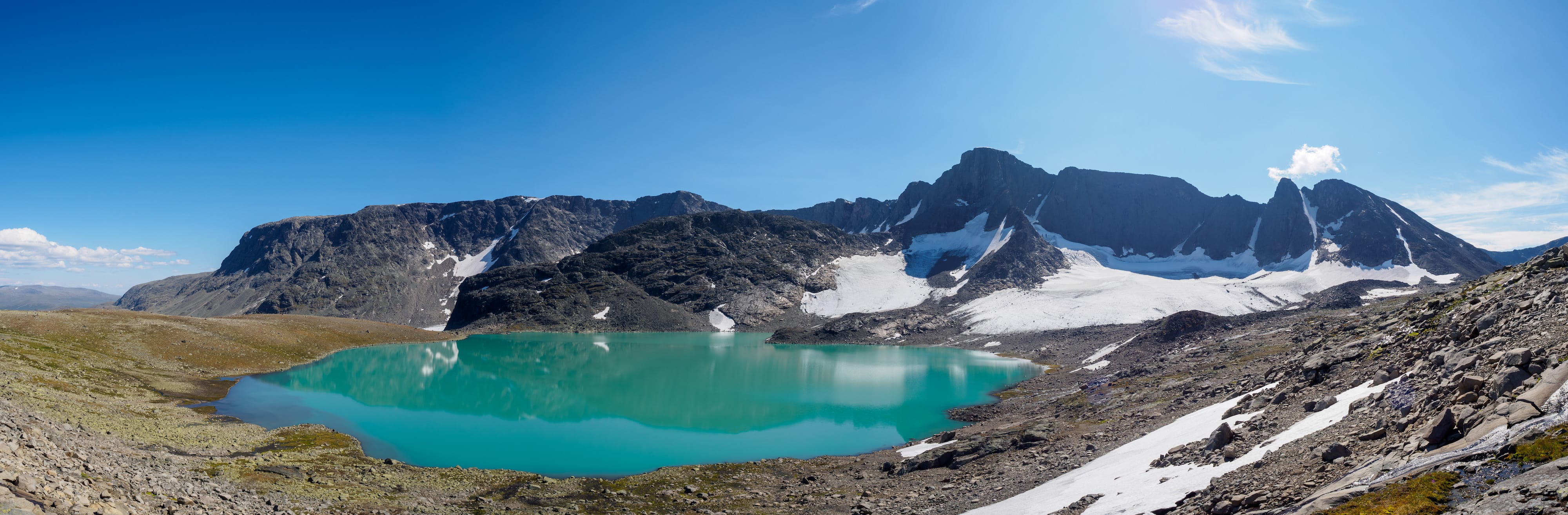 Etter å ha vært oppom Leirungskampen (2079 moh) og passert de to fortoppene var jeg mentalt innstilt på å bare kunne droppe ned i Leirungsdalen, men den gang ei. Nedstigningen til det vestre av Leirungtjønnin var full av løse store steiner, og krevde fullt fokus hele veien ned - jeg klarte å få en stein til å skli og lande litt nærmere foten min enn jeg skulle ønske. Allikevel gikk nedstigningen greit på en snau time, og vi kunne fylle opp vannflaskene igjen for første gang siden vi starta for drøyt 6 timer siden.