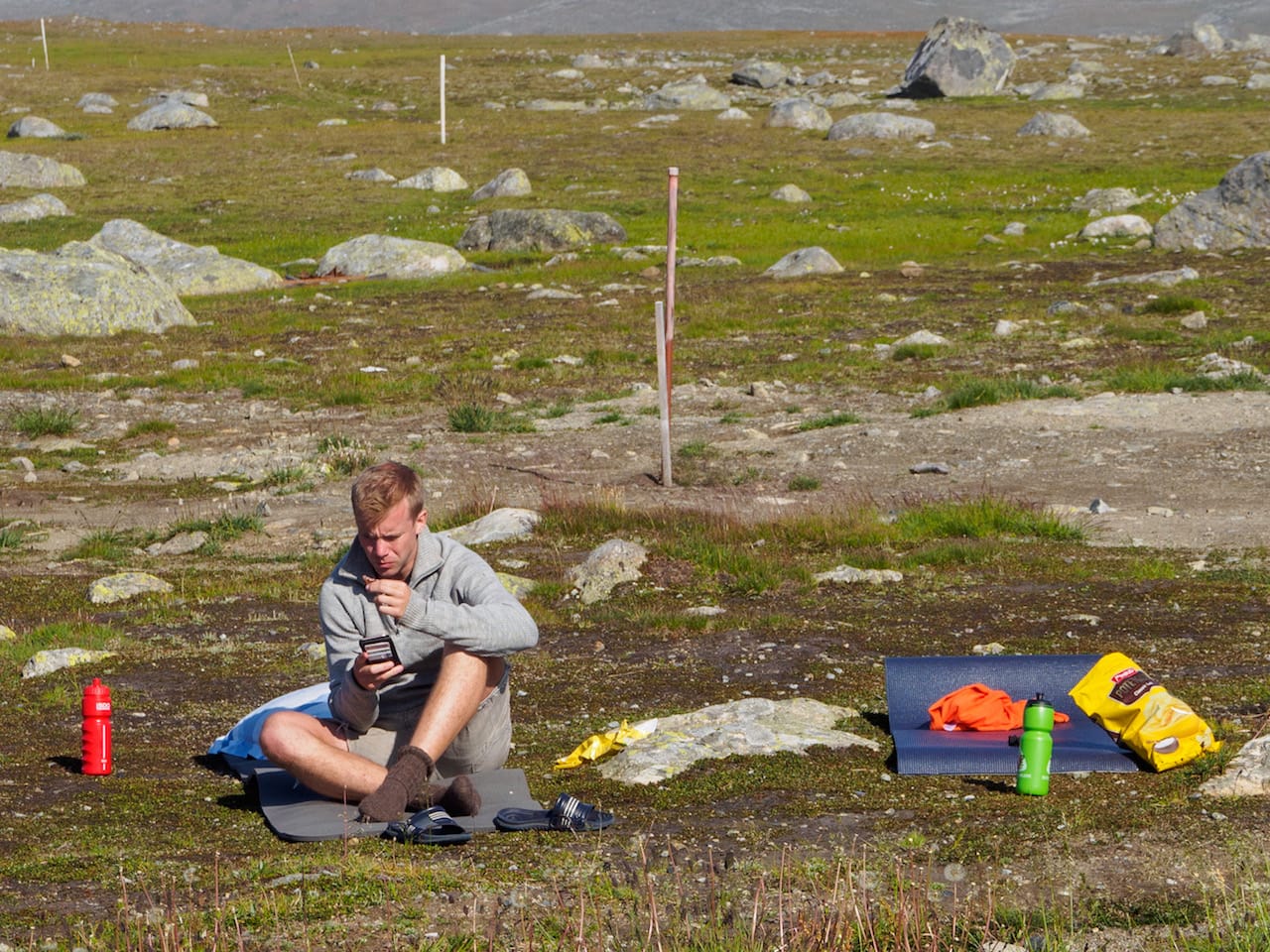 Vi var tilbake ved bilen såvidt over 9 timer etter start, og slo ganske fort ut hvert vårt liggeunderlag og senga om med litt godt å spise og drikke, bare for å komme oss litt etter turen. Ingen av oss var helt ødelagte, men kjente turen i beina.