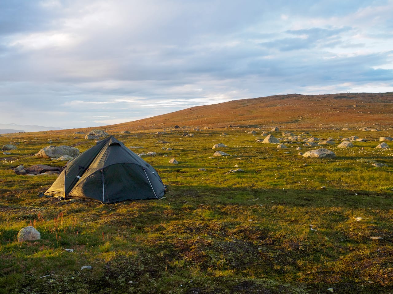 Kvelden ble ganske rolig - vi slo opp teltet igjen og krøp inn i det for å komme oss unna en lett vind som blåste opp, og holdt oss stort sett innendørs, med unntak av at jeg traska en liten tur opp på Fisketjernnuten i kvelninga (feilbruk av ordet “nut” etter min mening). I løpet av kvelden skya det også over, og vi fikk et par regndråper på teltet.