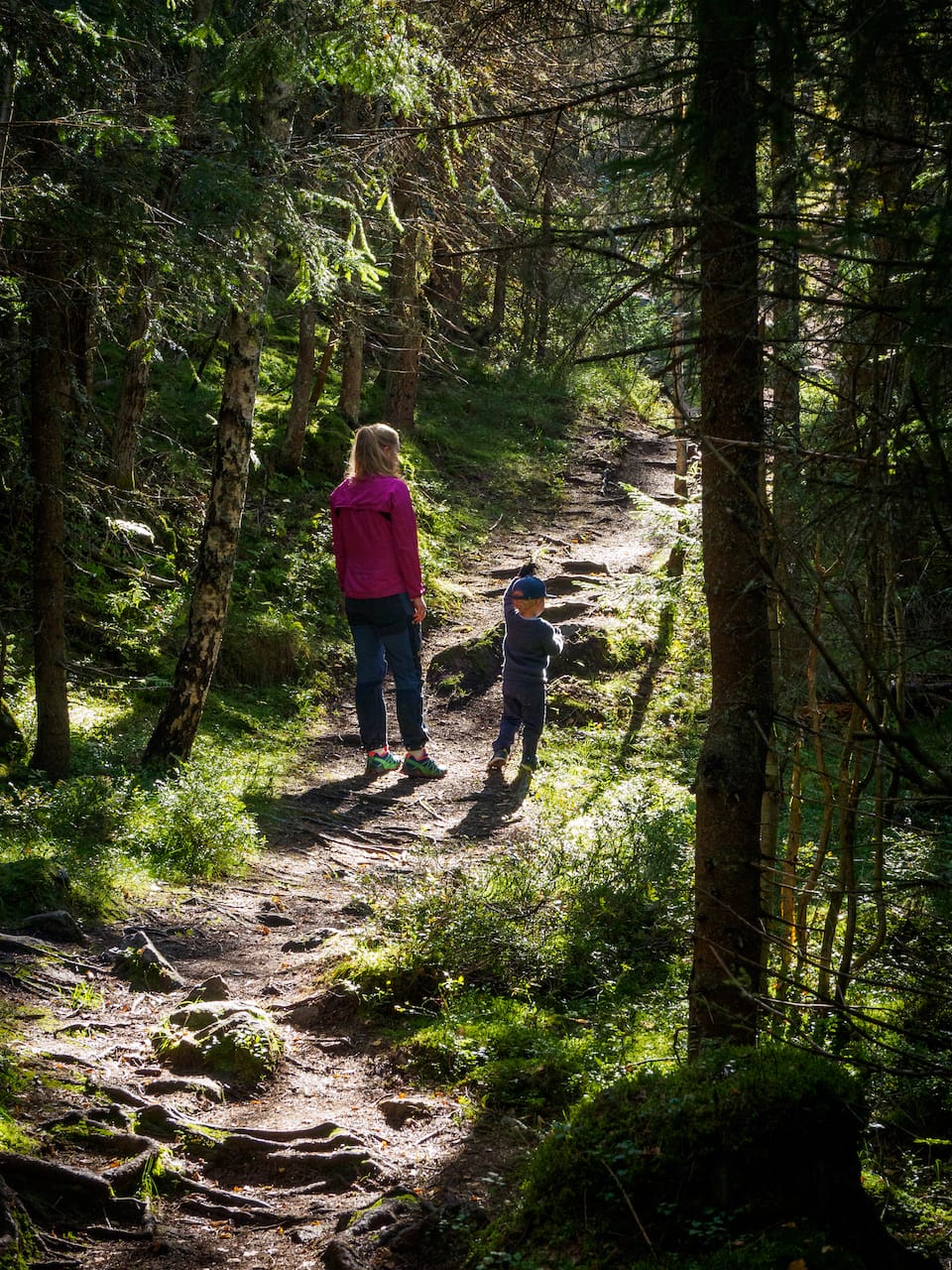 Herfra fulgte vi - eller prøvde å følge - den utmerka stien nedover Leirungsdalen. Jeg begynte å bli god og sliten, og Eirik hadde nok et betydelig bedre løpstempo nedover her. Heldigvis har han tålmodighet med en gammel og sliten storebror.