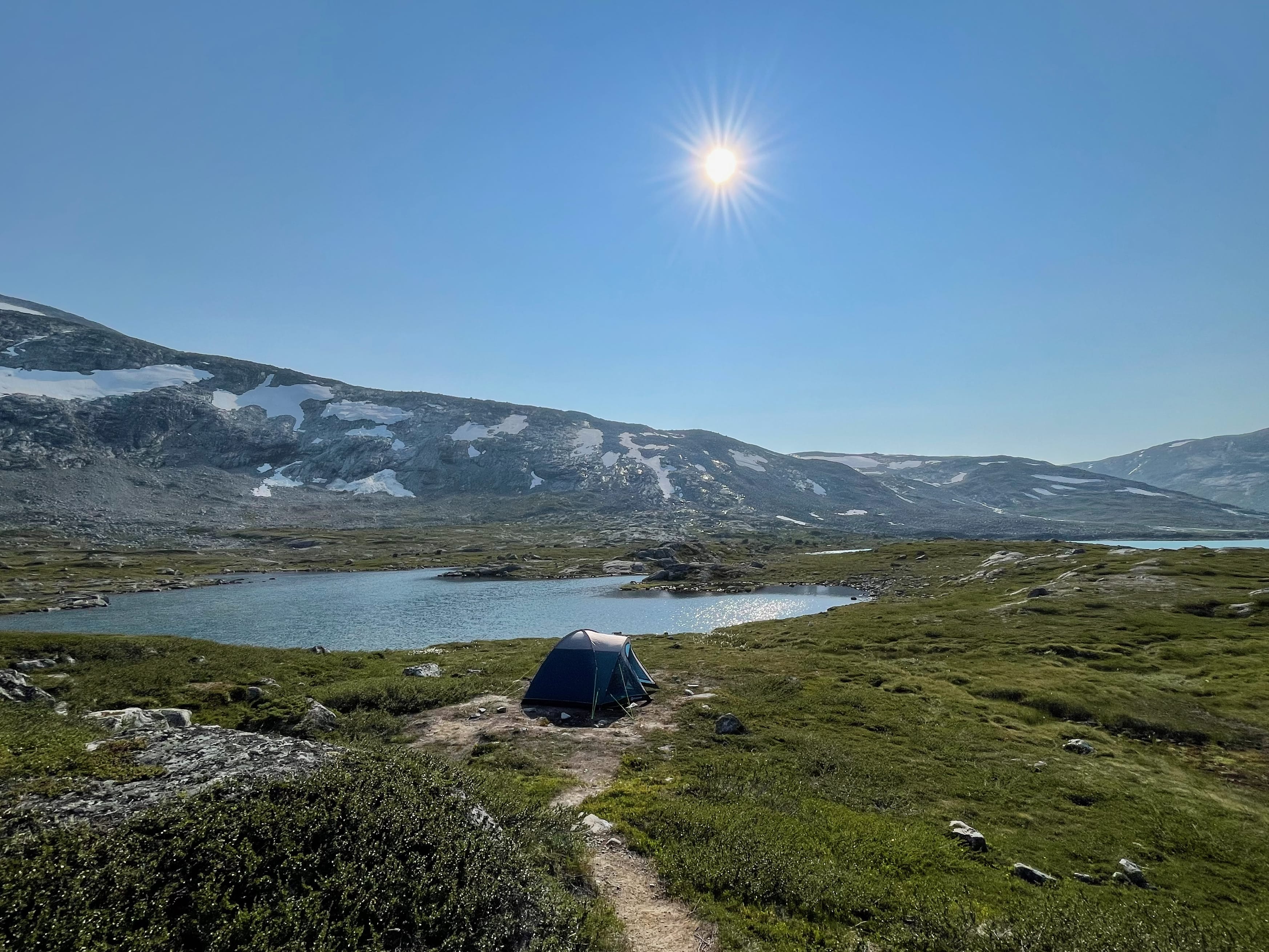 Fin teltplass rett ved gamle Valdresflya Vandrerhjem.